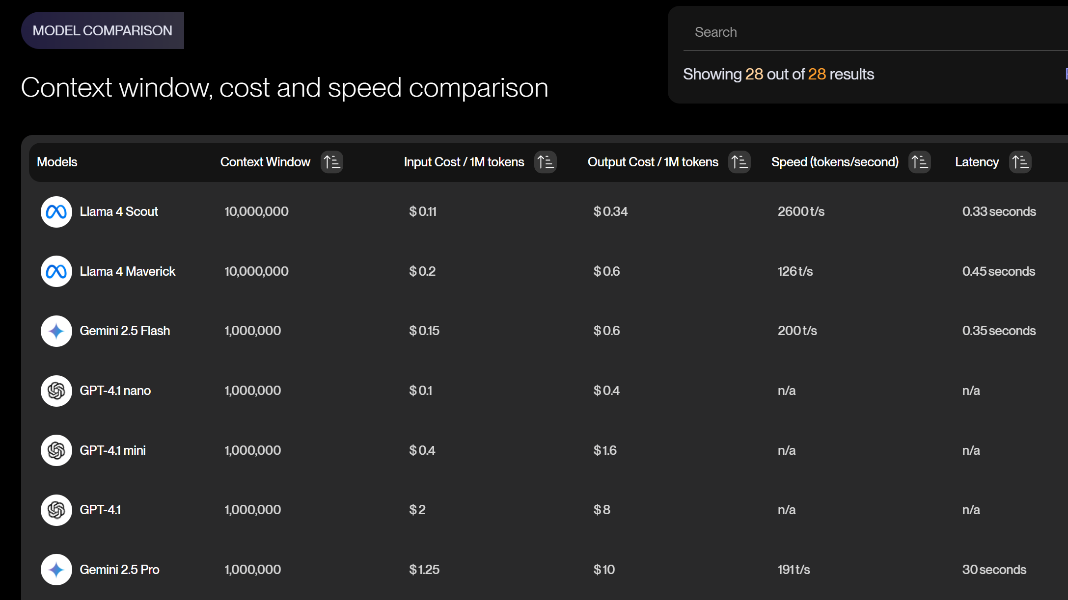 그리고 죽죽 내려가다보면 설명이 불필요할 정도로 직관적으로 되어있기에 해당 내용은 생략하기로 하겠다. 대신에 중간에 나오는 context window에 대해 언급하고자 한다. context window란 모델이 대화 내용을 얼마나 기억하고 이를 바탕으로 대답을 하는지에 관한 것이다. 이 얼마나 기억하는지에 대한 정량적인 수치가 토큰(토큰을 설명하자니 설명이 너무 길어지기에 생략하겠다.)수다. 최대 토큰이 몇이니? == context window 크기는 어떻게 되니?라고 보면 된다. 예시를 들어 설명하자면 셰익스피어 햄릿은 (영어 원문 기준으로) 약 3만 단어고 이는 약 5만 토큰을 사용한다고 한다. context window 사이즈가 5만이면, 셰익스피어 햄릿정도 기억한다고 보면 되겠다. tmi) 몇개월 전 까진 Gemini1.5 Flash의 context window가 1,000,000으로 압도적 1등이었는데.. 그새 3위로 내려왔고 백만도 흔해졌다. 참고로 백만이면 셰익스피어 작품 중 햄릿 뿐 아니라 모든 작품을 하나의 프롬프트에 넣을 수 있는 수준이다.