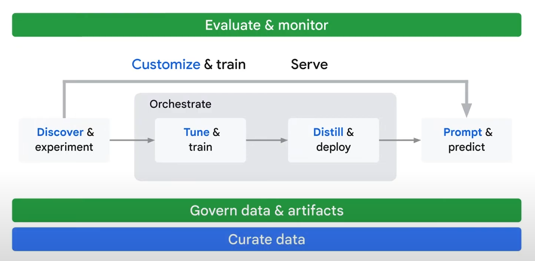 중간중간 traditional 모델과 비교가 있어서 볼드체한 글씨만 읽어도 된다. traditional ML workflow와 달리 생성형 AI 경우, 처음 experiment단에는 Discover가, 마지막 predict 단에는 prompt가 추가된다. 또한 experiement, discover 단계에서 바로 prompt&predict 단계로 간다(short cut으로 말이다). 이 때 프롬프트를 이용해서 즉시 예측을 가능하도록 한다. experiment 단계에서 넘어가면 기존에는 train으로 넘어가지만, 생성형 AI 경우는 새로운 단계가 2개 더 나오는데, 바로 1) customization&tuning 그리고 2) curate data(사진 제일 하단)이다. customization&tuning은 생성형 AI가 특정 task를 수행하기 위해 fine-tuning을 하고, pre-trained 모델을 customiation하는 것이다. 기존 ML 모델에서 바로 training하는 것과 대비된다. curate data는 선별된 데이터로 기존 ML에서 다량의 데이터를 사용하는것과 대비되는 모습이다. 데이터 레이크와 데이터 웨어하우스로부터 모델 학습에 적합한 데이터를 확보하도록 해야되는 것이다. 나아가 생성형 AI를 위한 MLOps에서는 새로운 artifacts를 관리(governing)하는 단계가 있다고 한다. 생성형 AI는 거버넌스가 필요한 layer, embedding과 같은 튜닝이 필요하다. 모니터링 단계에서는 새로운 metrics가 도입된다. 기존에는 accuracy나 precision을 측정했지만 이거로는 생성형 AI를 평가하는데 불충분하기 때문이다. 그래서 fluency, factuality, brand reputation과 같은 것들이 평가지표 주로 사용된다고 한다. 더 알고 싶다면 Vertex AI가 제공하는 도큐먼트를 참고하라고 한다. 마지막 단계에서는 curate data나 기업 데이터 통합을 한다. 기초 모델이 습득한 지식에 국한된것처럼 보이지만, 이걸 통해 더 정교한 데이터 access가 가능하다. 그러나 추가 데이터를 통합하면 새로운 평가 및 모니터링 문제가 발생하여 전반적으로 복잡성이 증가하게 된다. Vertex AI가 생성형 MLOps를 간소화할 수 있다고 한다.